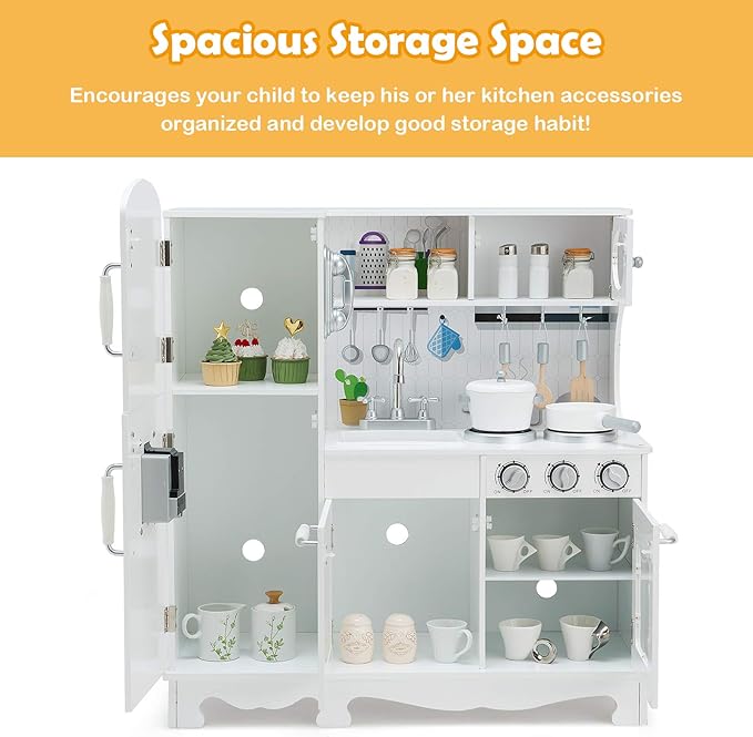 - 🍉【Large Built-in Storage Space】: Featuring multiple storage places including an oven, a refrigerator, a 2-tier open shelf and large cabinets, your kids can store all the food and kitchen accessories in them. Moreover, this kitchen play set also helps develop good habits and keep the play area neat.