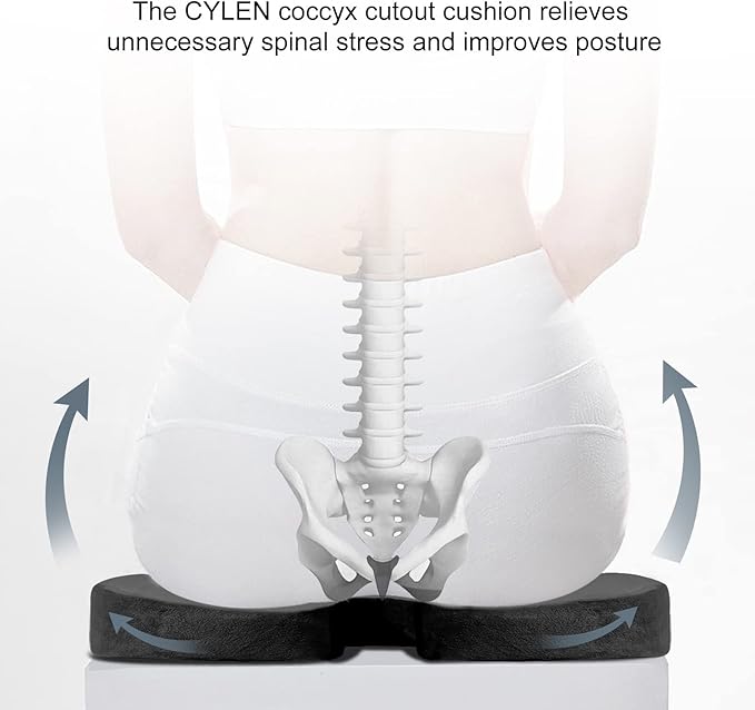 - ERGONOMIC "U" SHAPED CUTOUT DESIGN - Whether you're working from home, sitting in an office chair, a car or truck, or any kind of seat at all, the U-shaped cutout for your tailbone is specifically designed to maximize comfort and support while reducing pressure on your tailbone. The CYLEN office chair cushion can make your day more enjoyable and keep away those aches and pains