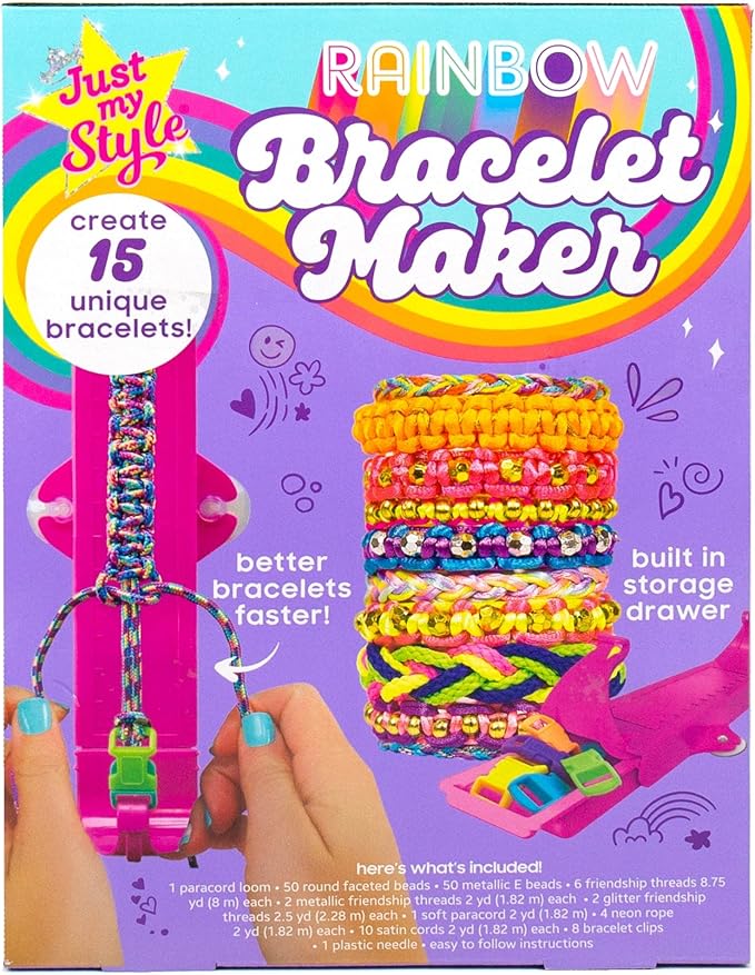 • SET INCLUDES: 1 Bracelet-Making Tool, 8 Paracord Bracelet Clips, 8.75 yds. Each, 8 Skeins Satin Cord (2 Blue, 1 Orange, 2 Pink, 1 Rainbow, 1 Yellow, 1 Purple) 2 yds. Each, 4 Skeins Metallic & Glitter Friendship Thread (1 Gold, 1 Silver, 1 Pink Glitter, 1 Purple Glitter), 4 Skeins Neon Rope (1 Pink, 1 Green, 1 Yellow, 1 Purple) 2 yds. Each, 1 Skein Multi-Colored Paracord (2 yds.), 2 Skeins Metallic Satin Cord (1 Blue, 1 Purple) 2 yds. Each, 50 Metallic Silver & Gold Round Faceted Beads, 50 Silver & Gold E-Beads, Easy-to-Follow Instructions