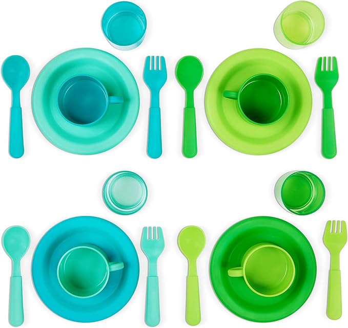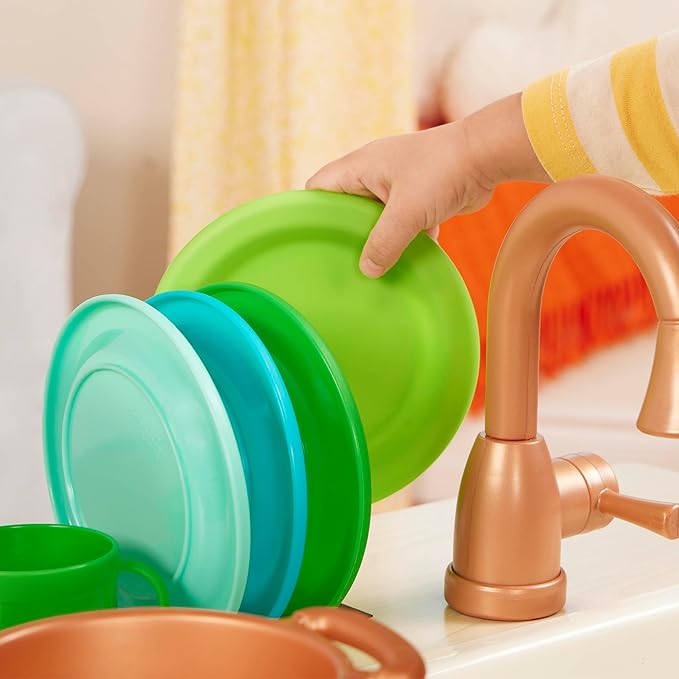 • 26-Piece Set: This kitchen comes with an oven, stovetop, sink, dish rack, a chalkboard, storage, dishtowel hanger, cookware, dishes, cutlery, and utensils.