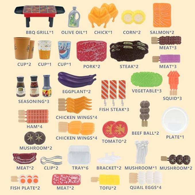 - 🍖【 80 Pcs Value Pack 】 The exquisite simulation kitchen toys includes: bbq grill*2, oil bottle*1, corn*2, grilled chicken*2, salmon*2, cup*2, drink*2, seasoning*3, steak*2, eggplant*2, and chicken wings, mushrooms , grilled sausage, squid, vegetables and dozens of barbecue accessories.Kids will have hours of fun and won't get boring easily.