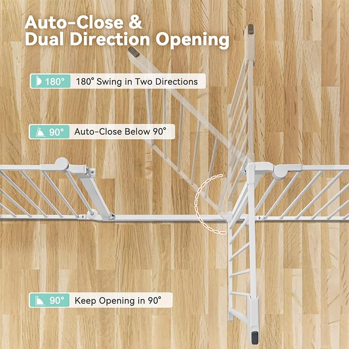 - Auto Close Gate & Easy to Use - Double-lock system, safety design. The super long pet gate will be closed automatically due to gravity. The door can be swung in both directions, easy to operate the puppy gate with one hand. No worries about forgetting to lock the pet gate.
