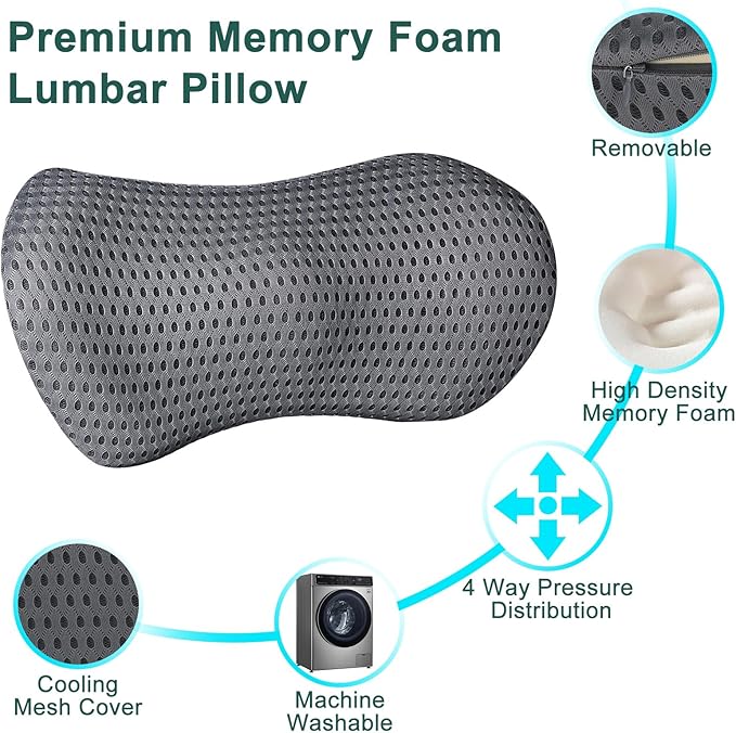 Lumbar Support Pillow, Memory Foam Neo Cushion Back Support Pillow for Lower Back Pain Relief, Ergonomic Lumbar Pillow for Car Seat, Office Chair, Bed and Recliner (Grey)