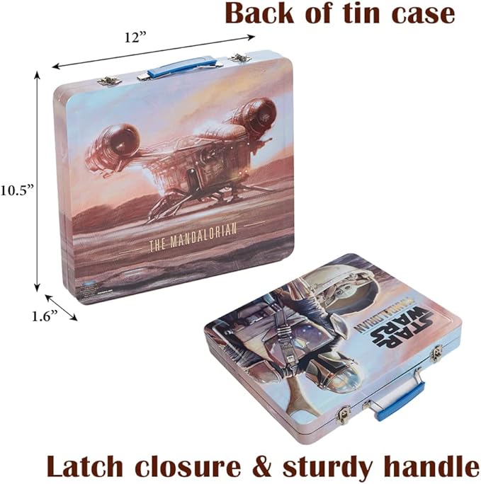 - FEATURES THE FAVORITE MANDALORIAN CHARACTERS - A bounty hunter and The Child Grogu are on the front of the tin. All of their friends are also ready to play on the art supplies and stickers included.