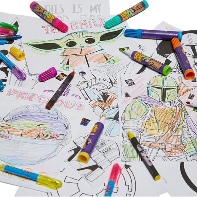 - DELUXE MANDALORIAN ACTIVITY SET INCLUDES: Tin carrying case (12 x 10.5), 30 coloring sheets, 568 stickers, 18 temporary tattoos, 12 crayons, 8 markers, 8 mini gel pens, stamp pad, giant stamper, stamper, eraser, and ruler (6 inch)