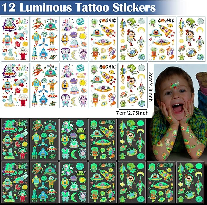 - FUN LUMINOUS TOYS:The luminous tattoo stickers will continue to glow in dark, the space-themed Rockets, sun, moon, galaxy, outer space, astronauts, aliens; rockets, UFOs, and more patterns are very attractive. There are many different patterns on each sheet tattoos. Children will love it. Rocket flashlight decoration can be hung on kids school bags or anywhere. Let's go explore outer space