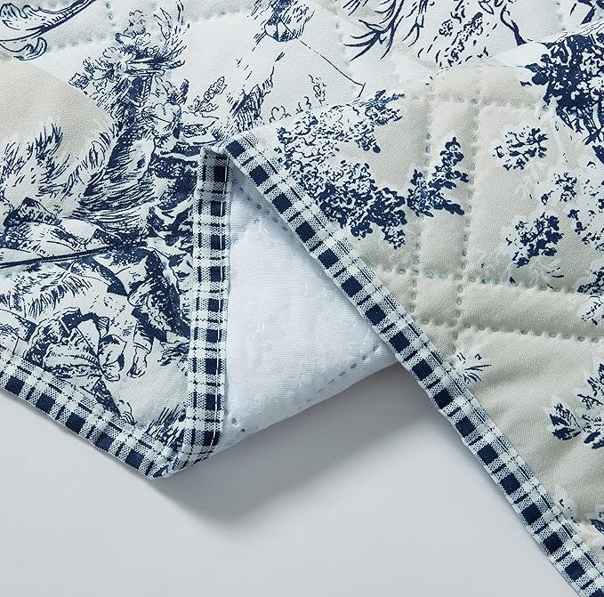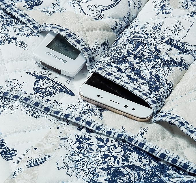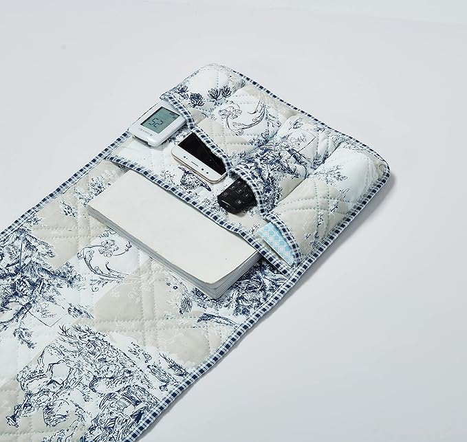 - ORGANIZER WITH UNIQUE DESIGN: Blue Toile in beige and ivory patches, with double diamond quilting, classic, elegant, and unique. Keep your accessories organized and protect your couch armrest against mess. Pets friendly. Made to enhance decor.