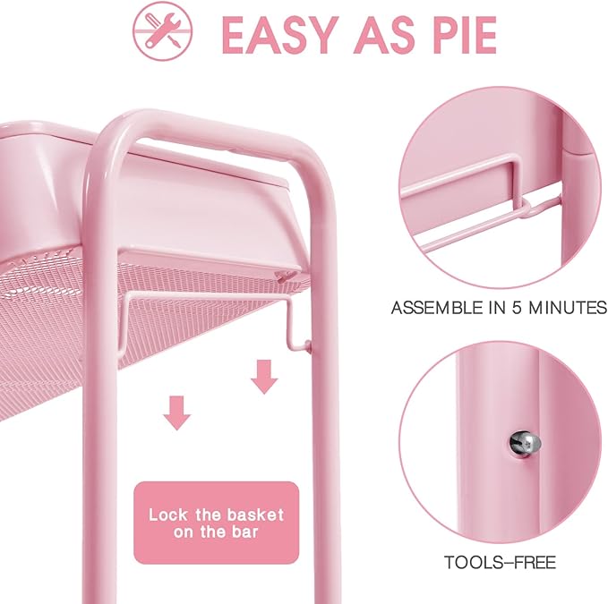 TOOLF 3-Tier Metal Rolling Cart with Wheels, Storage Utility Organizer Cart for Kitchen, Bathroom, Office, Baby Essentials & Makeup - Lockable Casters, Easy Assembly, Large Capacity, Pink
