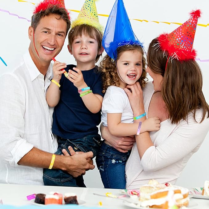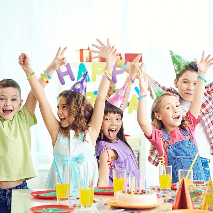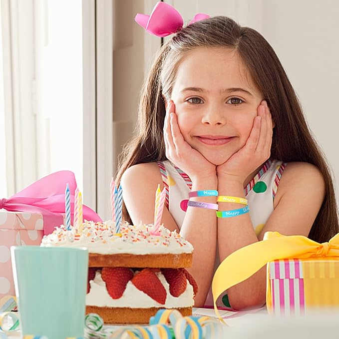 - Premium Material: All colorful birthday wristbands are made of high-quanlity silica gel material, non-toxic and stretchable, durable and elastic. Because of the premium silicone material, it is soft and safe enough for kids.