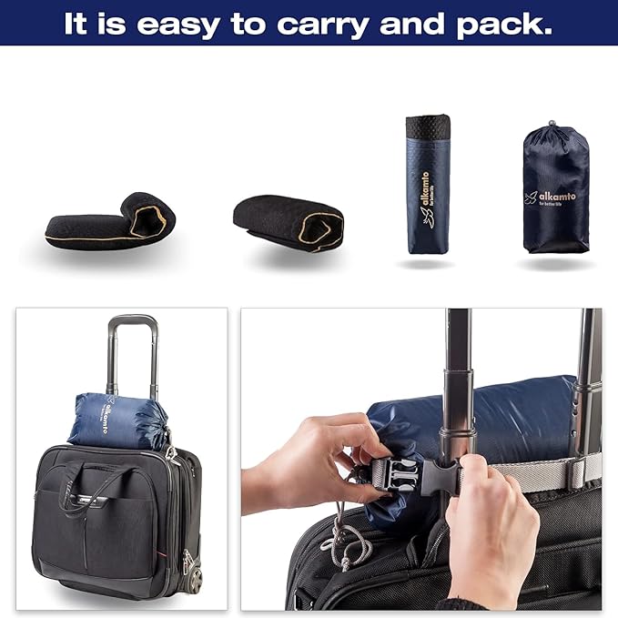 - ✔ LIGHT & EASY TO PACK - Easy to carry pillow around for all kinds of trips (like camping / fishing / backpacking / hiking / beach / festival) its lightweight design and travel case. Compressible and self-inflatable, easily be fitted inside its compact and small travel bag and rises up to its full shape once taken out in a matter of seconds. Ideal to take on airplanes, trains and cars or for outdoor activities along other camping gear, hiking and travelling accessories.