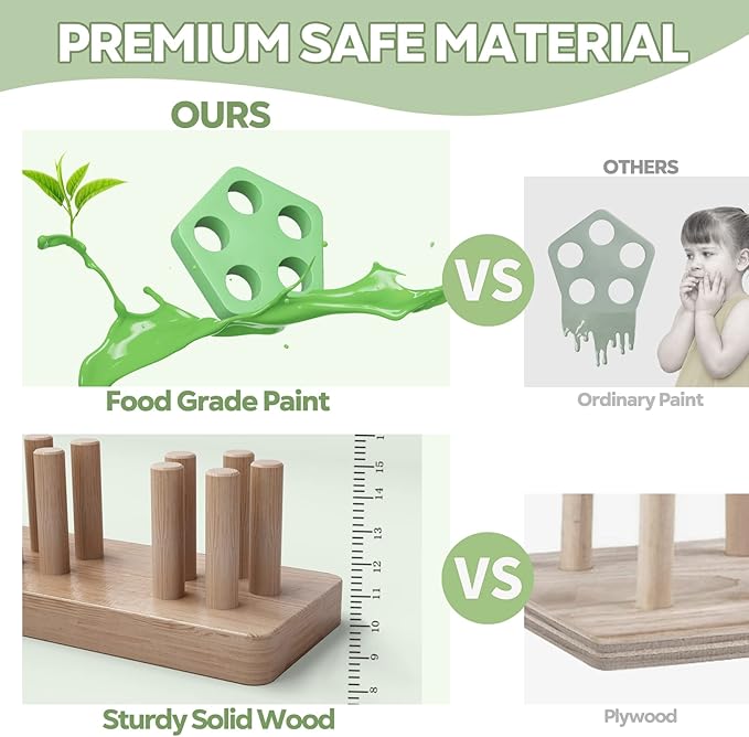 - Quality and Safety First: Our upgraded natural solid wood base with immovable pegs is thicker and heavier than other plywood ones, it's more sturdy and durable. Blocks are covered with food safe paint that are non-toxic, odorless and anti-fade, and they won't stick together. Smooth surface and round edges protect your baby's little hands from scratching. There's no choking hazard as the montessori baby toys passed the CPSIA 963 widget test.