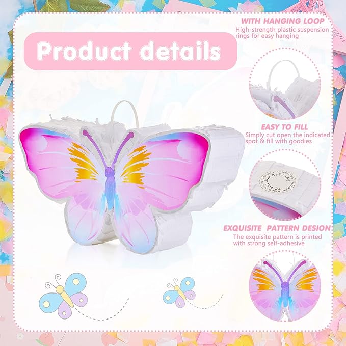 - Suitable Filling Size: the rainbow butterfly piñata is about 14.96 x 7.08 x 3 inches. Before buying, read the dimensions, featuring enough space for you to fill with candies, cookies, chocolates, confetti, etc., making your party more fun; The piñata is made of corrugated cardboard with vivid designs printed on both sides, with a plastic ring at the top for simply hanging from the ceiling, which will bring you a convenient way of using experience