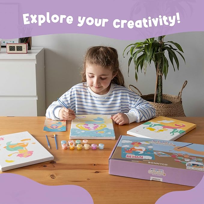 - 🧜 MERMAID ARTS AND CRAFTS FOR KIDS 🧜 Canvas painting kit for kids is a perfect boys and girls crafts sets that promotes creativity. Each set contains a training sheet, which is a replica of the painting that will give kids the chance to experiment first. In addition, it contains a model sheet that will act as a guide for the kids to review and check while painting the canvas kids crafts