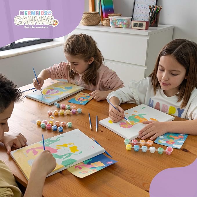 - 🧜 PACK OF 3 CANVASES 🧜 This painting by numbers contains a total of 3 canvases for many hours of entertainment. In addition, they are packaged separately and can be given to girls and boys individually so up to 3 kids could paint at the same time. Ideal to share with siblings, cousins, friends and even with parents. Kids paint by number canvas perfect as arts & crafts for girls and boys