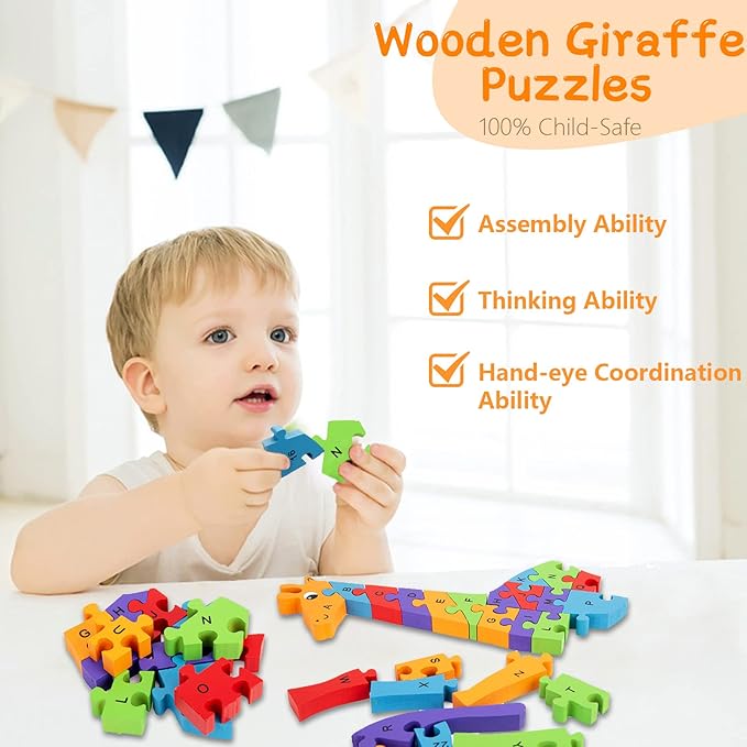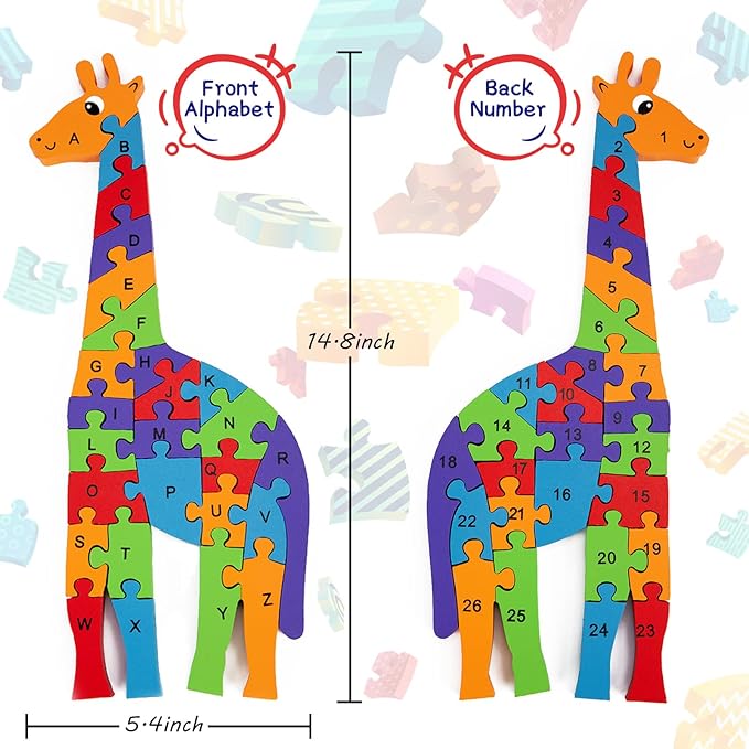 - Alphabet & Number - One side of our giraffe wooden puzzle are English letters A to Z and the other side are 26 numbers, every piece of wooden block has been painted. Our special wooden blocks can improve your kid's thinking ability, assembly ability, hand-eye coordination ability, patience, memory, and fun ways to learn letters and numbers