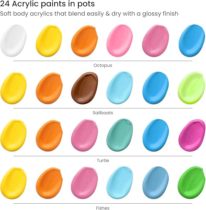 - Colorful Ocean Adventure: Painting the creatures of the deep has never been this fun! Our painting kit includes four color reference guides to help your kid to get just the right shade. Each painting canvas has its own paint set, brush, and mixing tray so multiple children can paint together.