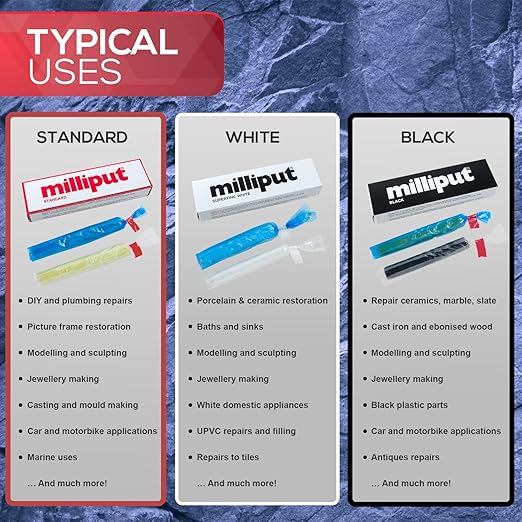 - ✅ PRACTICAL – This complete 10 piece epoxy putty kit from Creative Crafters contains everything you need for DIY repairs and small craft projects. With one pack of black Milliput epoxy putty, six double ended sculpting tools, a fine grain sanding sponge and two pairs of latex free gloves, this all purpose putty kit is as a practical as you.