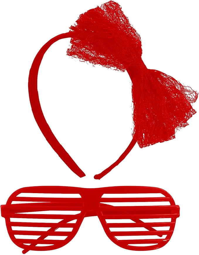 - Package Content: 1 pc red net yarn skirt(waist wide: 6.8"/17.5cm, which can be stretched to17"/43cm), 1 pair long gloves(10.2"/26cm), 1 pair of red leggings socks(13.7"/35cm), 4 pcs solid color necklace(14.7"/35cm), a pair of shutters glasses and 1 pc lace headband bow.