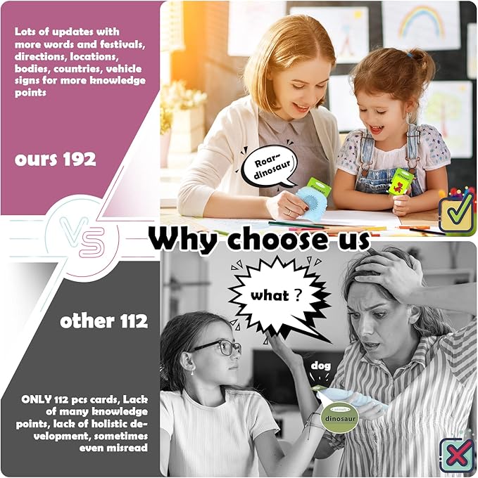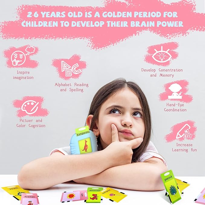 - ABC Learning Toys for Toddlers—Upgarded 384words talking flash cards, New addition of letters and numbers theme, vocabulary has been increased by nearly half after the update. Just insert the flash card into the machine, will tell you the words on the flash cards and simulate the sounds of the items, perfect combination of sound and image, let children naturally identify new things through interaction with the learning card machine, and improve their vocab words and cognitive abilities!