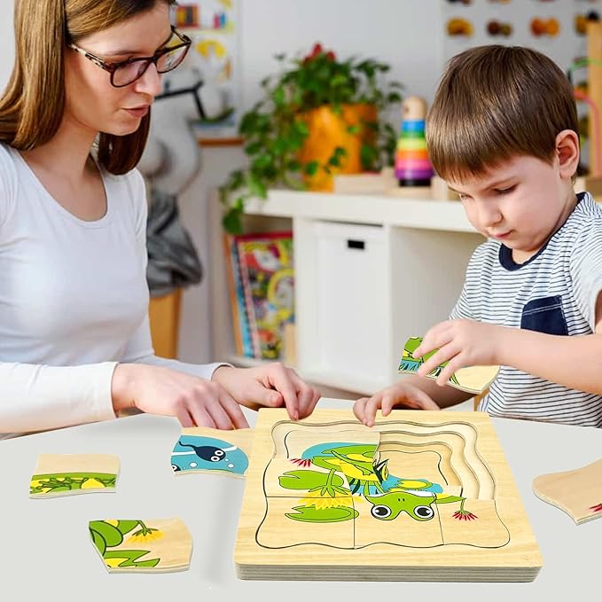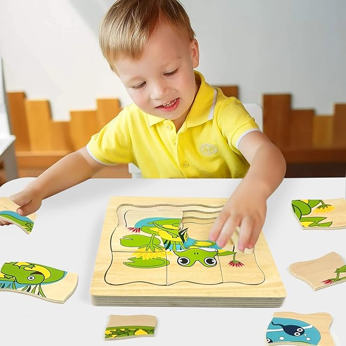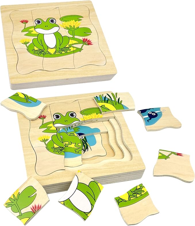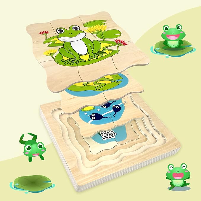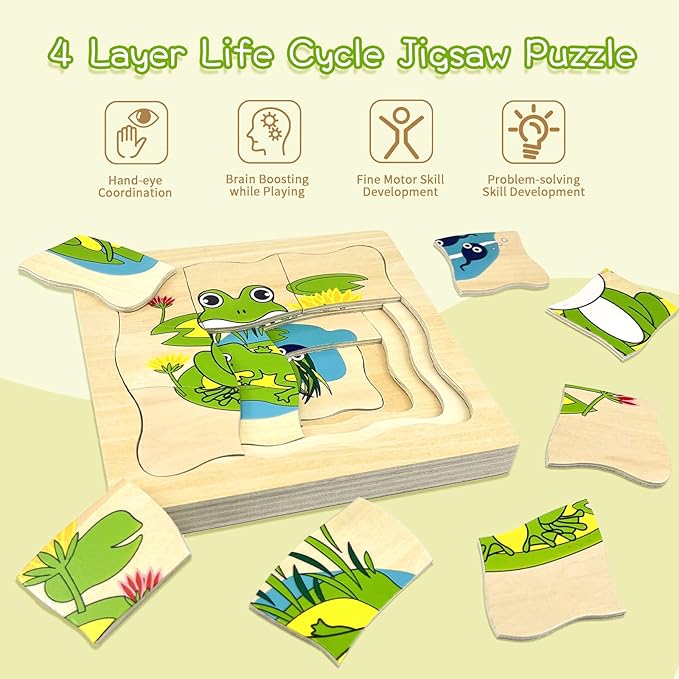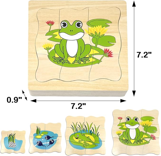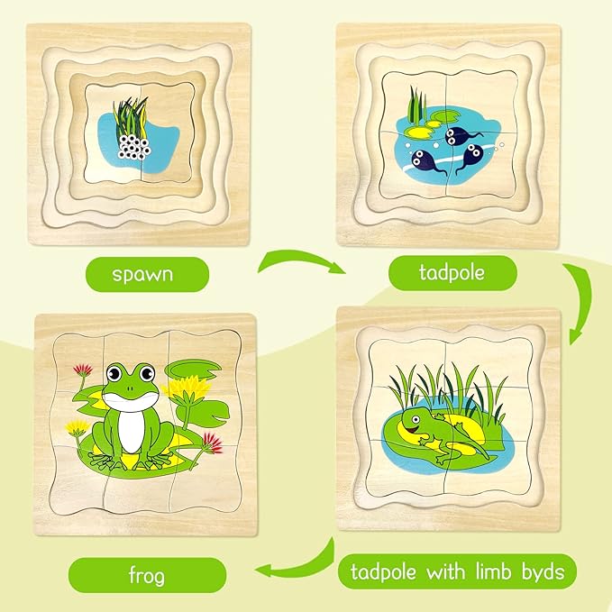 - Montessori Wooden Puzzles for Kids 4-8: The life cycle of frog jigsaw puzzle is a wooden layered puzzle presenting the growth cycle concept. It shows the passage of time with the development of the images, each phase of growth is bigger and requires more pieces to complete the picture, total 20 puzzle pieces.