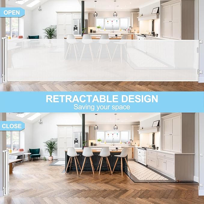 - [120" Extra Wide & Retractable Design] Extra wide retractable baby gates can be extended up to 120 inches wide and 35 inches tall. (inner size:120" wide,full size:122" wide). Mesh can be completely retracted away when not in use.