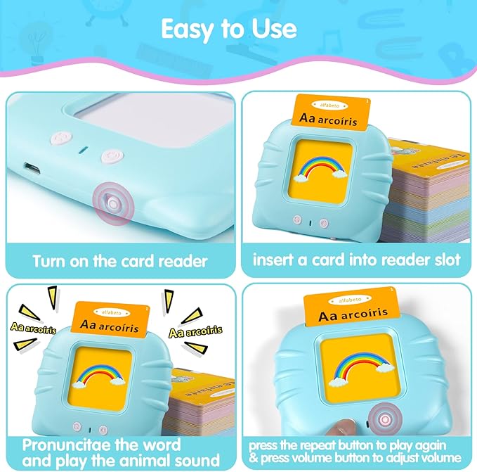 - [ Easy to Use ] - Put the card into the card reader’s slot, the card reader will pronounce the words in both English & Spanish. When an animal card or transport card is inserted the card reader will play real animal or transport’s sound. Press the repeat button to repeat the pronunciation and sound effect.