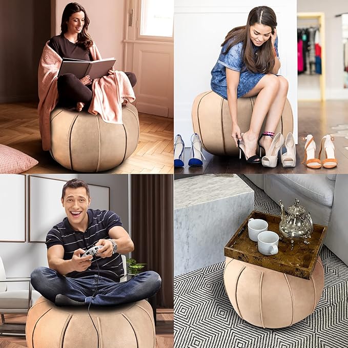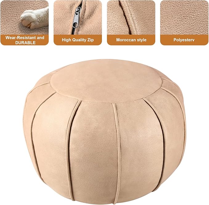 - COMFORT and COMPACT: Leather ottoman dimension is approximately 21” dia. and 13” high, weighing a mere 1.1 lbs. (unstuffed weight). Lightweight & portable design makes pouf fit in perfectly just about anywhere.