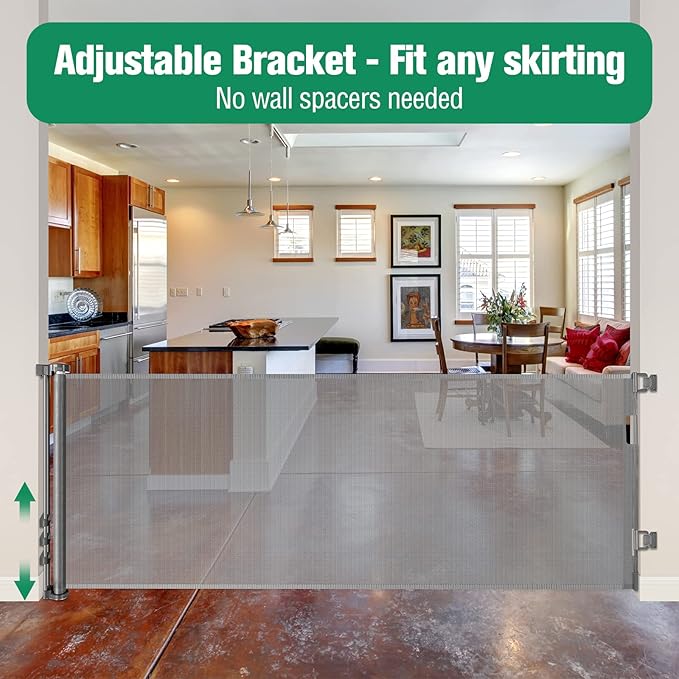 - Fits Any Baseboard: There is an adjustable bracket at the bottom of retractable baby gate to fit any height baseboard without wall spacers, making it safer, more practical and easier to install.