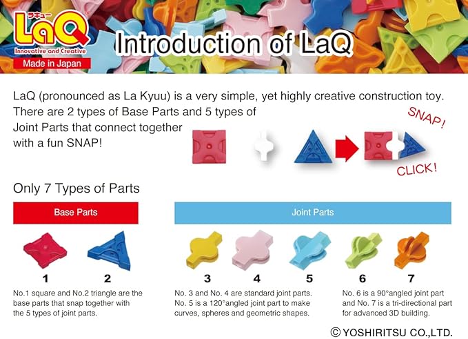 - WHAT'S LaQ? LaQ was invented to be a highly unique and creative construction toy using only 7 types of parts that makes fun snapping sounds when connecting. LaQ building stimulates the senses of sight, sound and touch, and snapping the parts together is a satisfying tactile experience promoting concentration through play. The open-ended possibilities of LaQ is limitless, and is recognized as an ideal creative toy for children as well as being an engaging creative tool for adults.