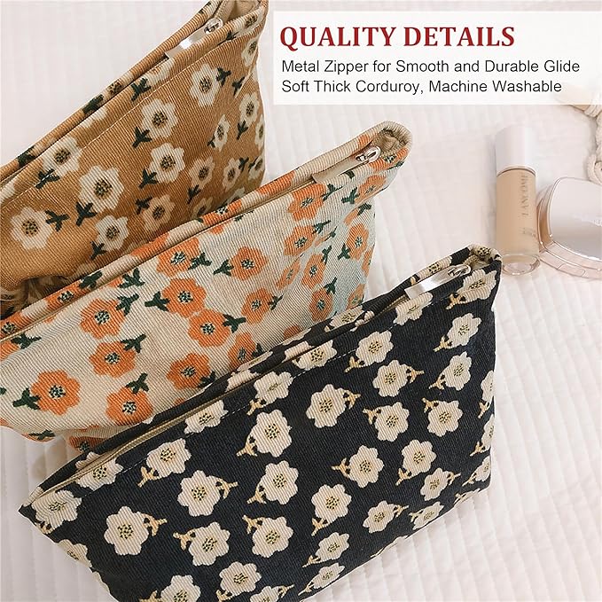 HAPPYHEIDI Women Floral Corduroy Canvas Makeup Bag Travel Cosmetic Pouch Purse Organizer, Cute Beige