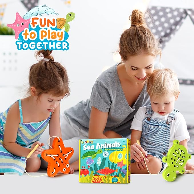 - CUTE WOOD SEA ANIMAL LACING TOY: Cute and fun wooden threading toy for your kids that includes 1 lacing turtle toy and 1 starfish toy that can help develop the lacing and motor skills of your baby, A perfect lacing toy for kids with a storage bag that you can use to put the wooden lacing toy and bring it anywhere you want