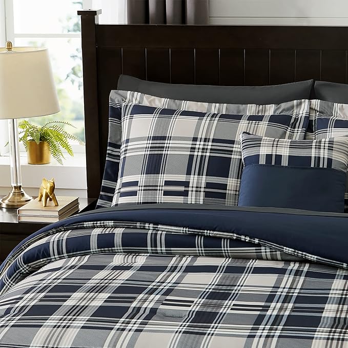 MaiRêve Queen Size Comforter Set Navy Blue, Classic Plaid Farmhouse 7 Pieces Bedding Set, All Season Lightweight Bed in a Bag with Sheets, Pillowcases & Shams
