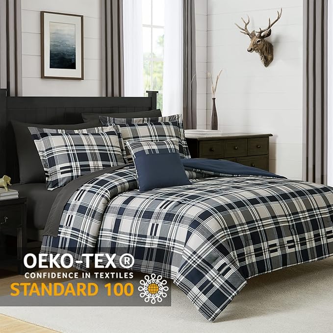- Plaid Design: Upgrade your bedroom decoration with our plaid comforter set queen, endows it with classic nobleness and coziness. Fitted sheet is designed with a storage pocket, which is convenient and practical.(NO DECO PILLOW)