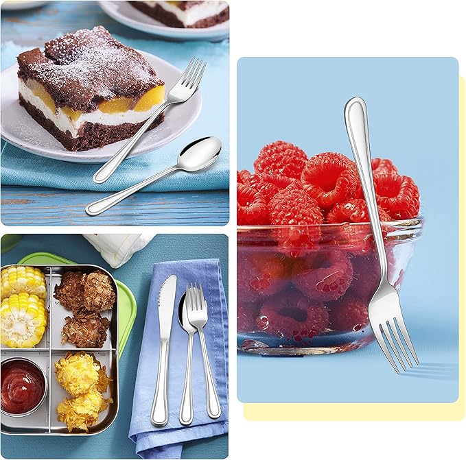 - 【EASY MAINTAIN & CLEAN】High shinny surface good stain resistant and no easy discolor, Always look like as new after long-time use and easy wash in the dishwasher well, Effortless maintenance, Great as kids every day silverware set, Recommended for children over 2 years old