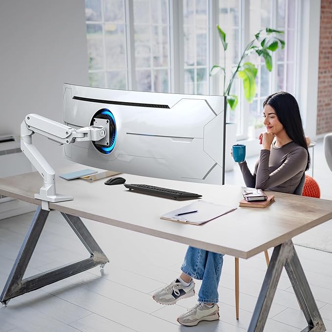 BEWISER Heavy Duty Monitor Arm Mount for 34-49 inches and Ultra 57 inches Screens,Weight Capacity Up to 44 lbs,Full Motion Height Swivel Adjustable Monitor Arm(White)
