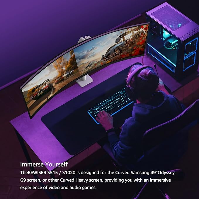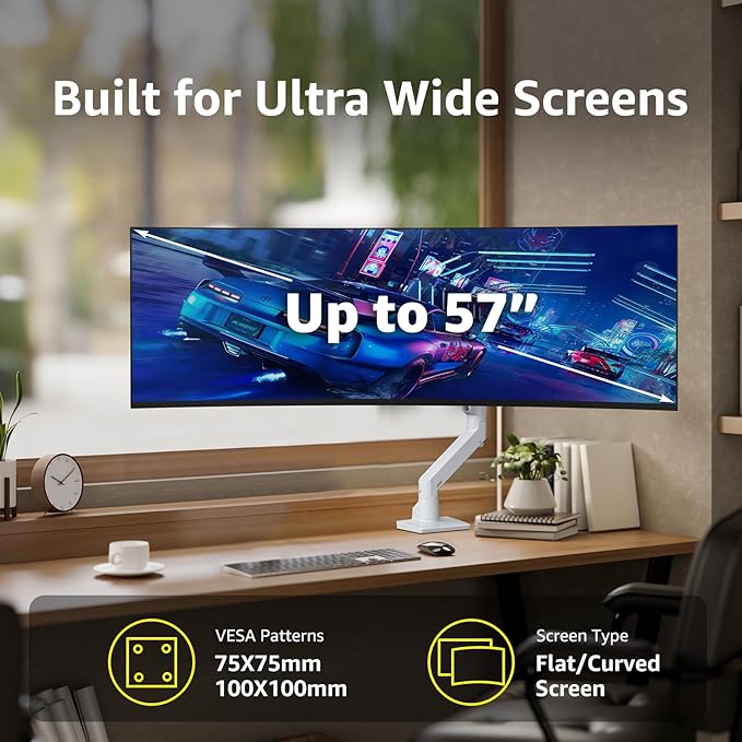 - Suit For Ultra Wide Screens: BEWISER Heavy Duty Monitor Arm fits most 34-57 Inch Curved and Flat Screens. Heavy duty monitor arm securely lifts, turns and tilts ultrawide monitors for an immersive viewing experience for work or gaming. Comes with interchangeable C-clamp or grommet base mount for use on desktops up to 2.4 inches thick.