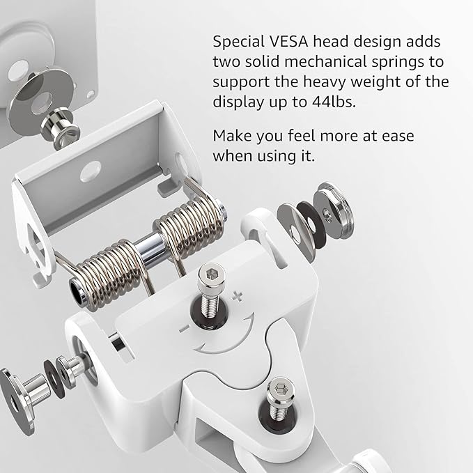 - The highlight: In the VESA head, we add two powerful mechanical springs. Special vesa head design, able to support heavy weight monitor(Max 20kgs) without the appearance of drooping your monitor.