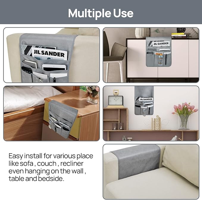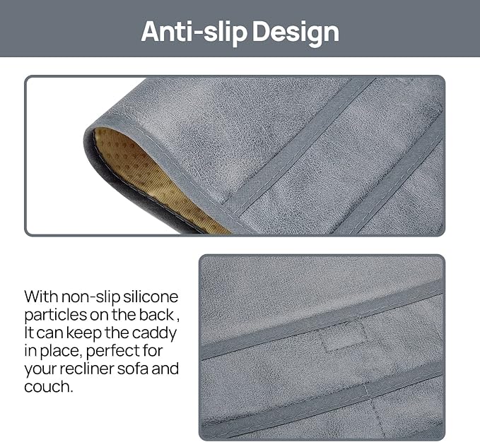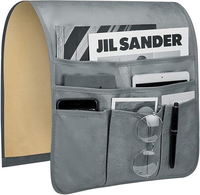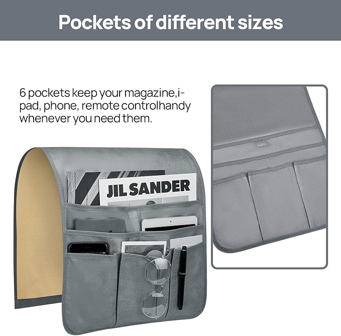 Teniux Remote Control Holder Faux Leather Armrest Organizer with 6 Pockets for Recliner Couch Sofa, Armchair Caddy for Smart Phone, Book, Magazines, Ipad, Remotes (Grey)