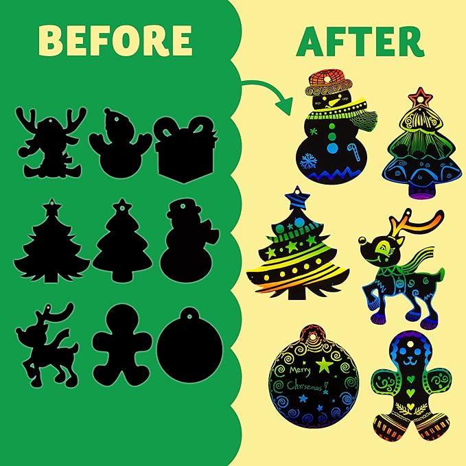 • INSPIRE CREATIVITY. Bring your kids’ imagination to life! When you scratch, a rainbow of colors will reveal. These ornaments will add some homemade holiday cheer to Santa, Reindeer, Snowflakes, Gifts, Christmas Trees, and other holiday décor.