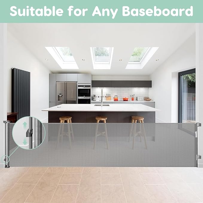 - Fits Any Baseboard : No need to buy extra spacers, our extra wide retractable pet gate accessories can be adjusted up and down to fit Any Baseboard.