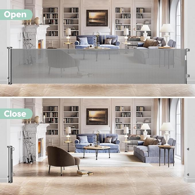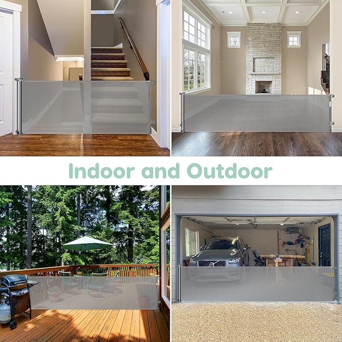 - Retractable Gate: The extra wide dog gate for the house can be retracted, so you can roll up the mesh when you don't need to use it and save your space. Easy for your friends to pass through the outdoor baby gate when you have a party or friends visiting your home.