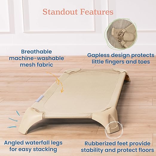 • Classroom Cot: Set of six stacking cots for rest time in childcare centers, daycares, and classrooms; elevate children off the floor to keep them cool, clean, and stable