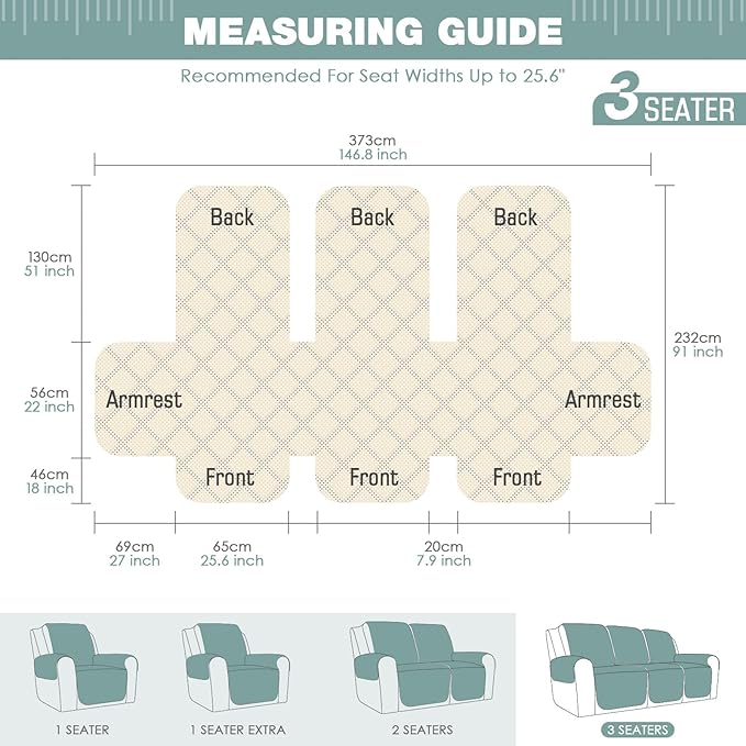 - 【DIMENSIONS GUIDE】 New colors and styles will make your furniture more unique and welcoming. 3 seater recliner cover fit a sofa with a seat width of 76.8 in, see measurement guide in photos. NOTE: Please confirm the size before purchasing