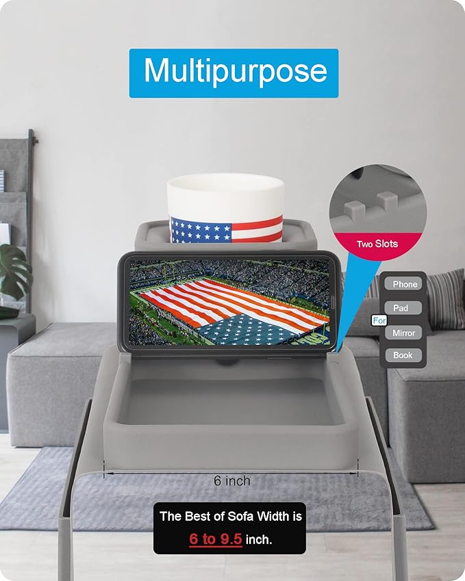 - ✅ LARGER SIZE, LARGER CUP HOLDER, LARGER TRAY: This couch tray has upgraded size and silicone material to fit sofas with 9.5inch wide armrests. The wider tray (6in) can easily hold your cell phones, ipad, remote controls, earbuds or snacks. Cup holder (width 4in) also increased the size and depth (3.5in), can hold multiple cup sizes, including handles on mugs.