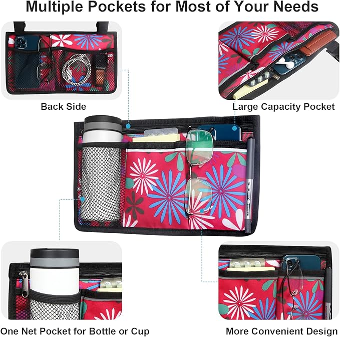 Wheelchair Side Bag, Upgrade Flower Color Wheelchair Armrest Storage Pouch with Cup Holder and Reflective Strip Made with Waterproof Fabric, for Most Wheelchairs, Walkers and Rollators (Red Fireworks)