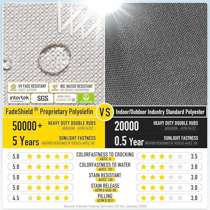 - 【FadeShield - UV Fade Resistant】FadeShield Proprietary Polyolefin are dependable indoor/outdoor performance fabrics, they are infused with antimiсrоbial silver Ion technology and can withstand 5 years of UV fade resistance, solution-dyed to make sure that each color is deeply ingrained in every fiber for continued vibrancy, even after heavy use. 80% water resistant (not entirely waterproof). We recommend bringing it indoors when it rains or when not in use to preserve its lifespan and keep it looking beautiful.