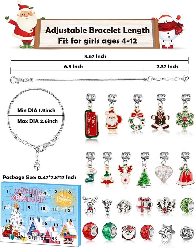 - Charm Bracelet Advent Calendar 2024: This Christmas themed jewelry making kit includes 2 piece bracelet, 1 necklace, merry christmas tag, Christmas tree and wreath, Santa clause, red, blue, and green crystal beads. Super cute and festival.