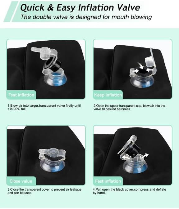 - ✈️UNIQUE HUMANIZED DESIGN: This inflatable leg rest has two separate air chambers. The lower chamber for 1-level height, and the upper chamber for 2-level height. With 2-in-1 double valve, the upper black air valve is a one-way air inlet for inflating or replenishing gas. Bottom transparent air valve can be quickly inflated and deflated. What's more, the double valve is designed for mouth blowing, It only takes about one or half minutes with a few breathes. Release the air only 3-5 seconds.