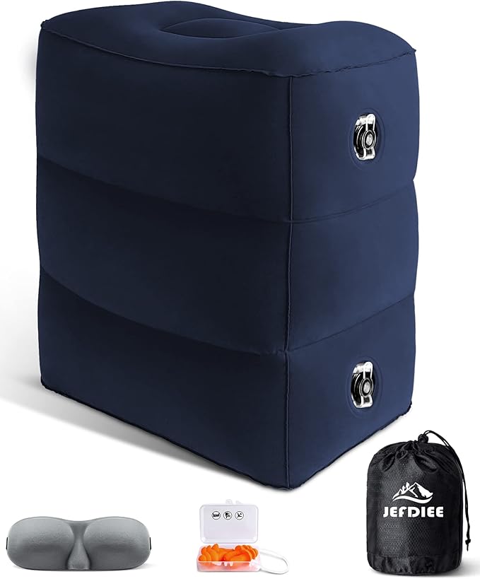 JefDiee Inflatable Travel Foot Rest Pillow, Kids Airplane Bed, Adjustable 3 Layers Height Leg Rest Pillow, Adults Travel Essentials Great for Airplane, Office, Home, Trains, Cars (Blue)