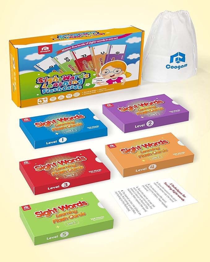 - 260 Pcs Flash Cards: The Sight word learning flash card set comes with 260 pcs of double-sided Sight words in 5 individual packs, with a piece of guidanceon how to use the cards; and some game suggestions to have fun and learn with kids.